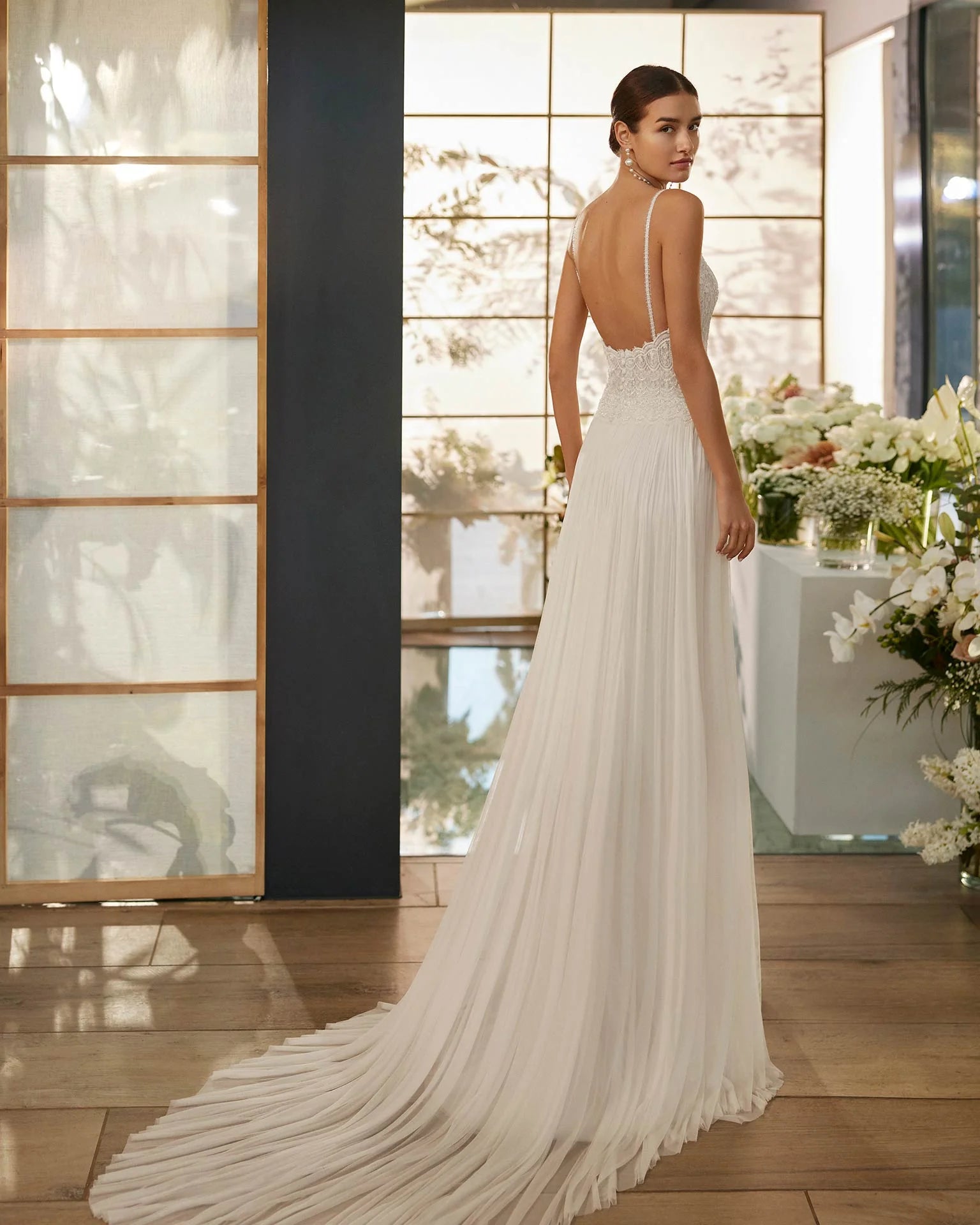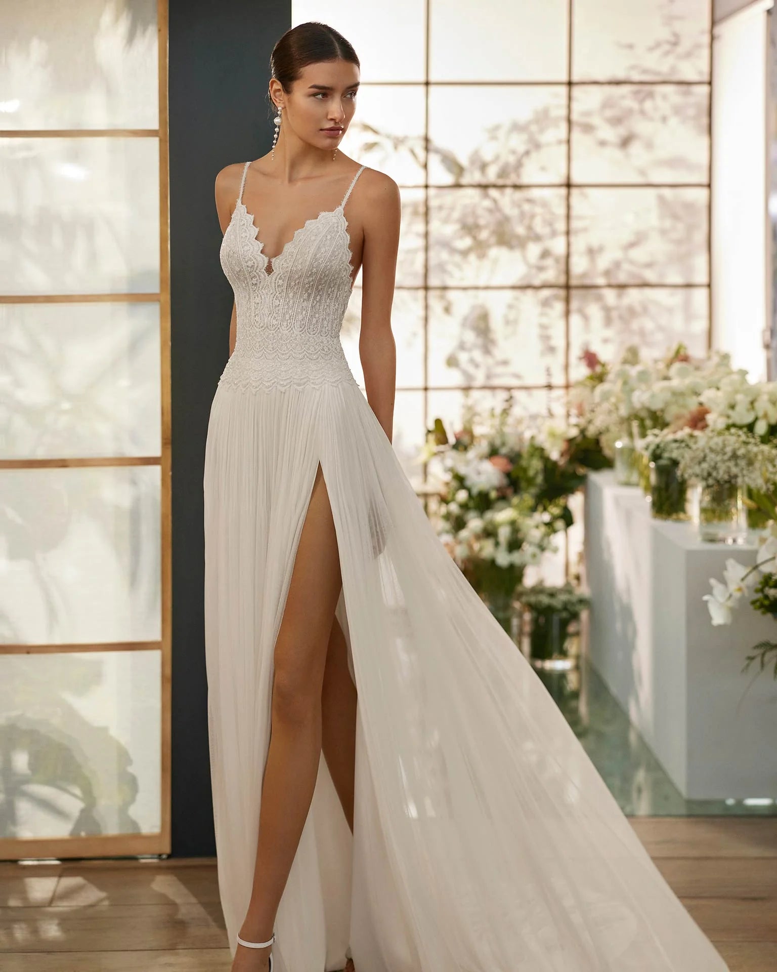 Gerade geschnittenes, modernes Brautkleid aus Spitze, Strass und Seidenmusselin. Mit tiefem Ausschnitt vorne und hinten, Trägern und geschlitztem Rock vorne.